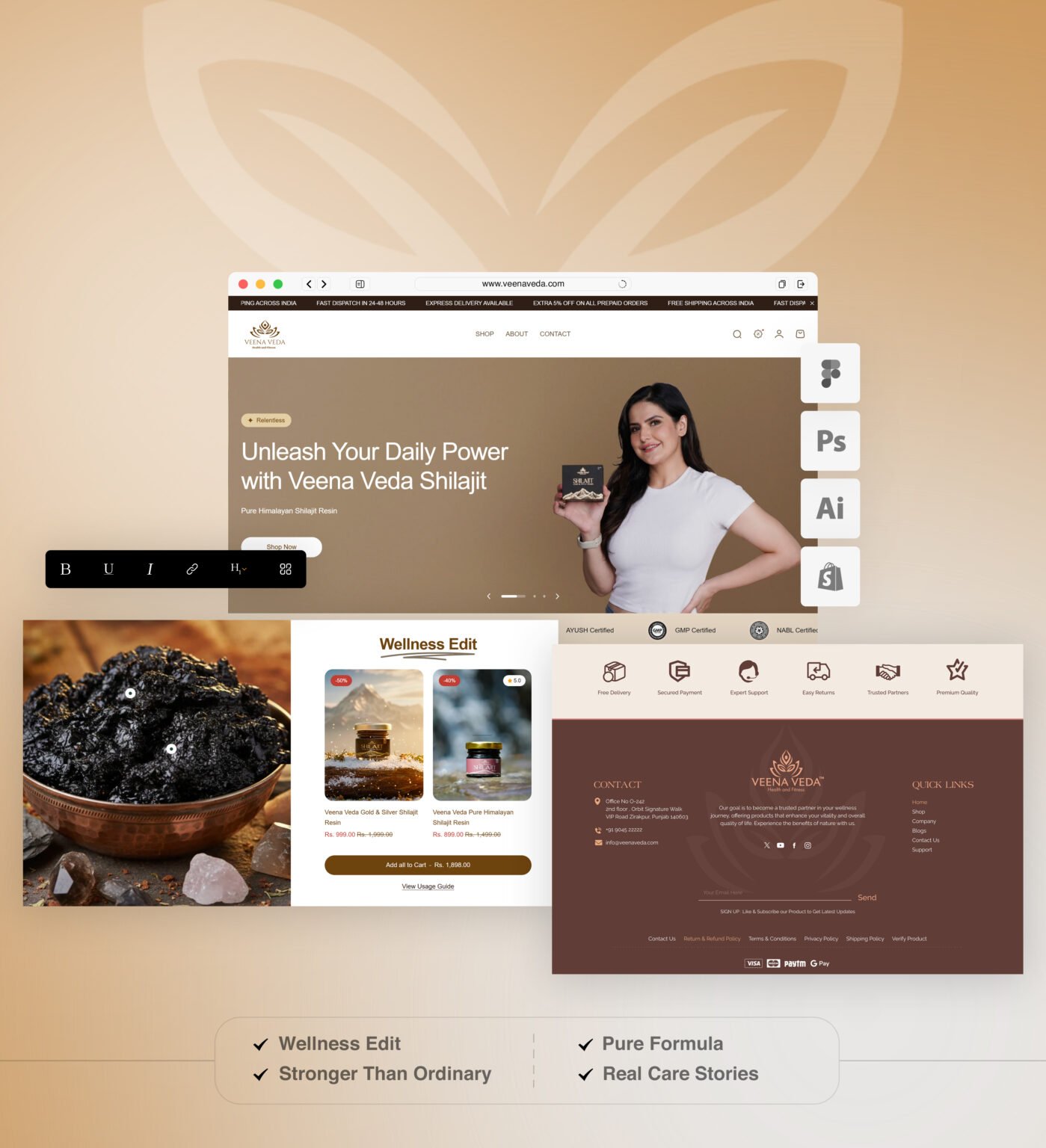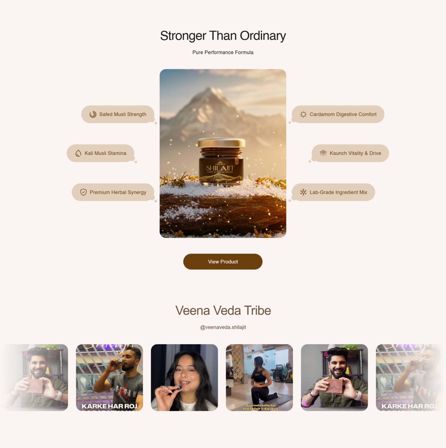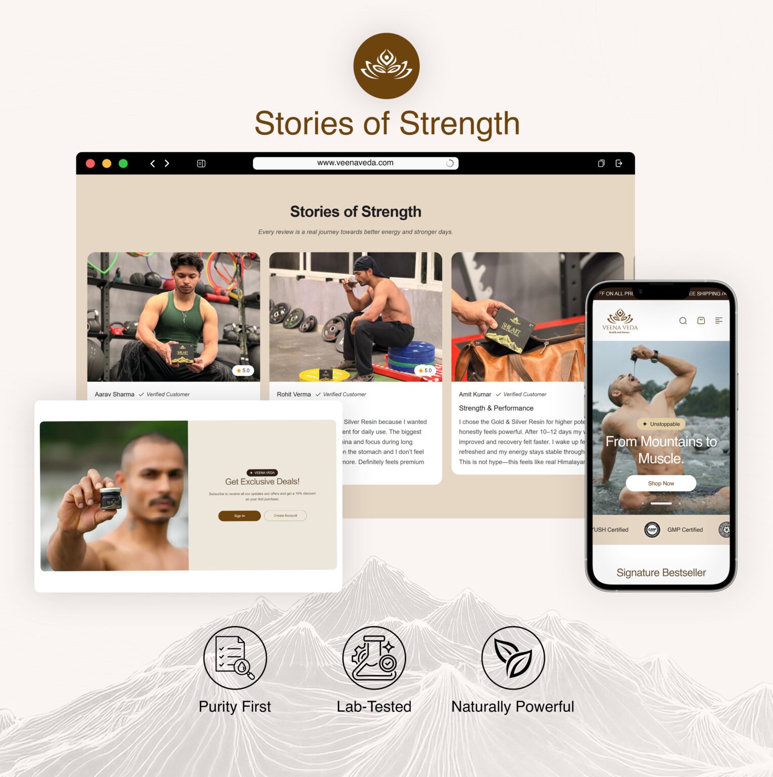 The Veena Veda website is an e-commerce platform designed to promote and sell premium Ayurvedic wellness products, primarily focused on Himalayan Shilajit supplements. The platform combines modern design with traditional Ayurvedic positioning to create a trust-driven, conversion-focused digital experience.